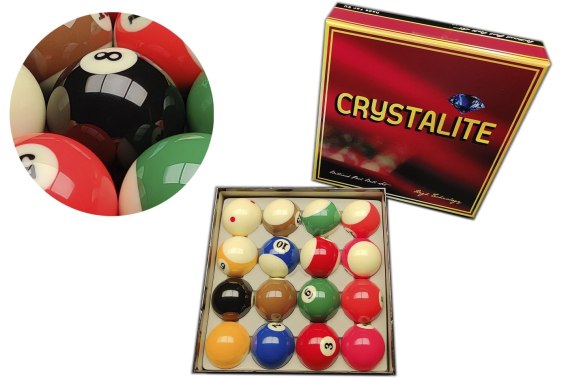 Bile CRYSTALITE Super Pro TV wykonane są z żywicy fenolowej. W komplecie zamiast tradycyjnej białej bili, znajduje się bila telewizyjna Red Dot (czerwone kropki), która znakomicie pokazuje nadaną rotację bili białej.