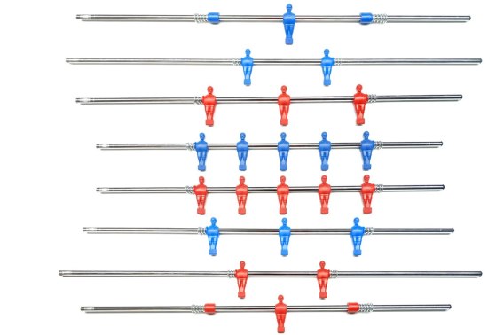 Zestaw stalowych drążków przelotowych, dedykowanych do stolików piłkarskich marki Garlando, łączy w sobie trwałość i elegancję. Drążki o zewnętrznej średnicy 16 mm i grubości ścianki 2,2 mm, zostały pokryte chromem, gwarantującym skuteczną ochronę przed rdzą. Dodatkowym atutem jest estetyka - gracze ożywiają stół swoimi żywymi, kontrastującymi kolorami: czerwonym i niebieskim.